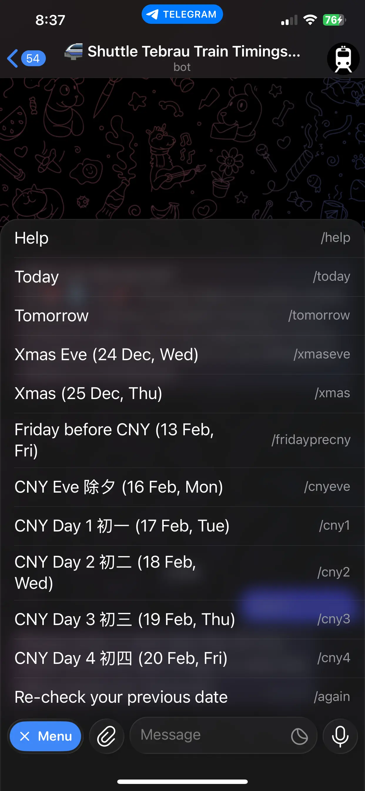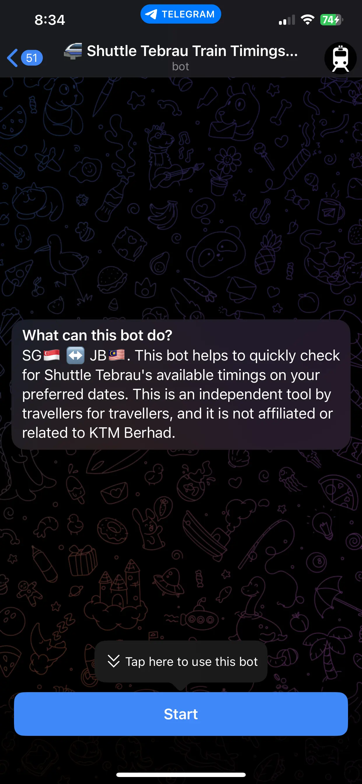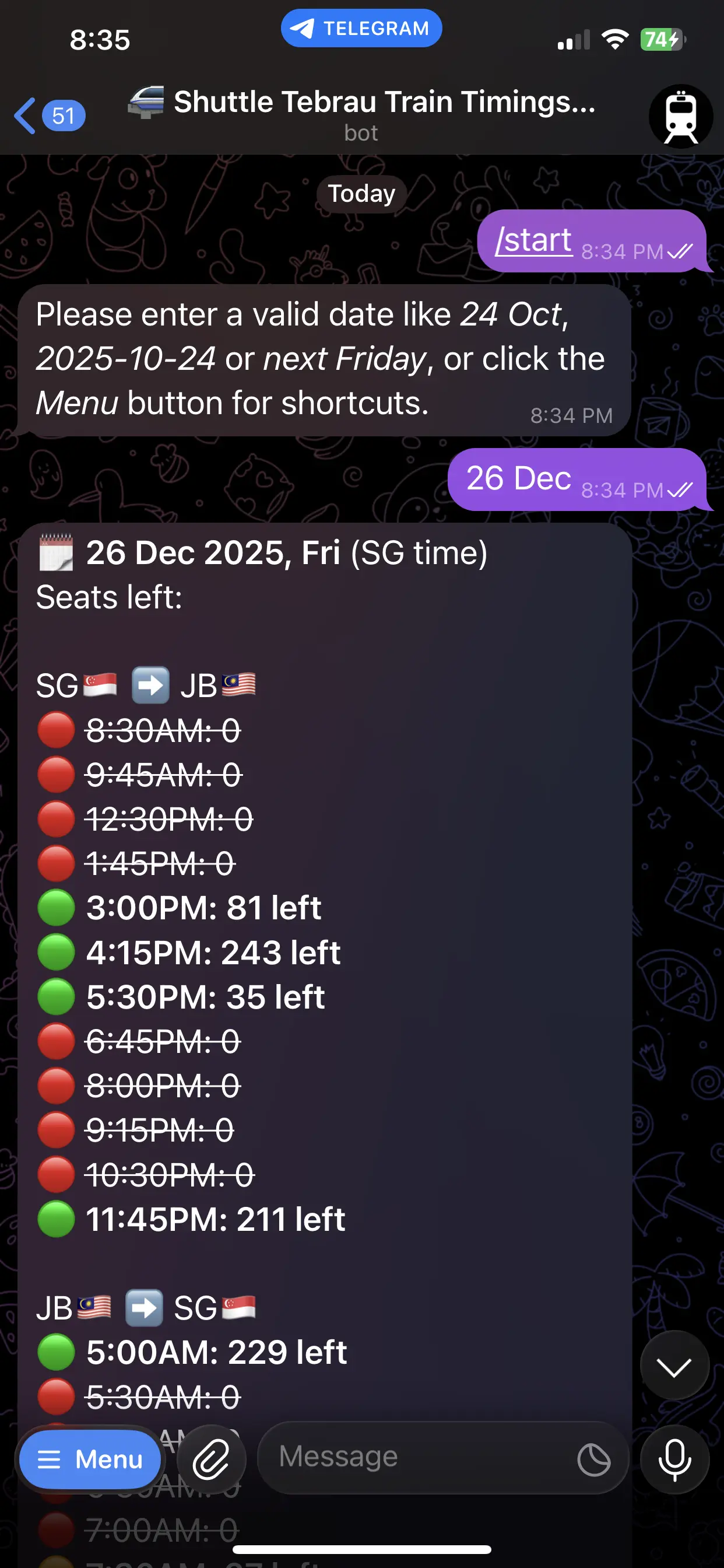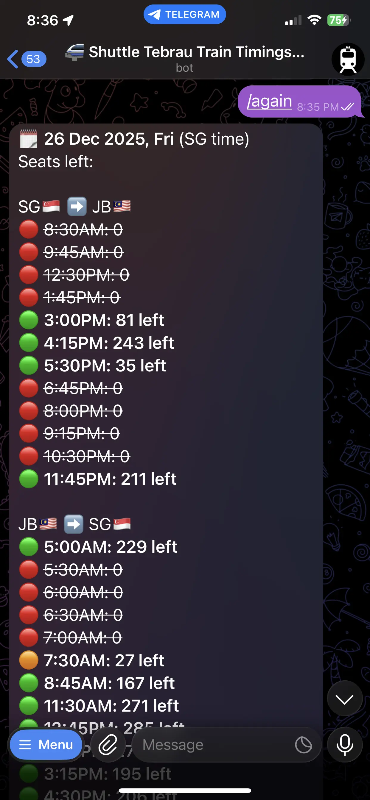 Open in TelegramThis availability Telegram bot is for searches only. It cannot be used to purchase tickets. To book your tickets, please visit the official KTMB website at https://shuttleonline.ktmb.com.my/Home/Shuttle .